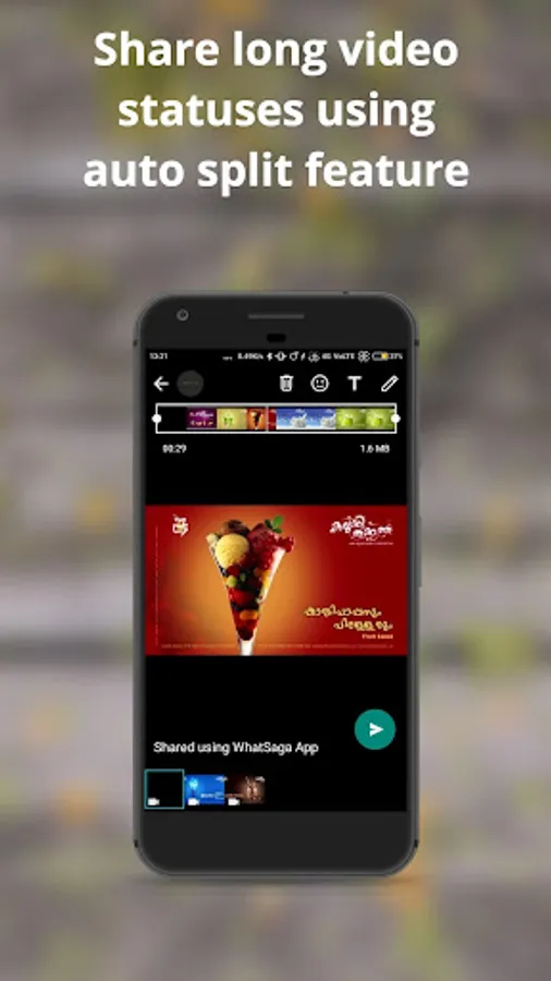 Posting long video statuses to WhatsApp is just easier because you don't need to cut them down manually, WhatSaga will do it for you in an instant and share it to WhatsApp.