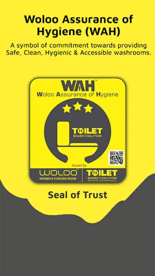 Each washroom hosted by Woloo-Host follows a standard protocol to ensure safety, cleanliness, and hygiene therefore ensuring that women do not have to think twice before walking into a Woloo enabled loo. These washrooms are certified in association with the Toilet Board Coalition (A global non-profit enterprise working under World Bank to improve sanitation standard across 40+ countries) and the Woloo Assurance of Hygiene (WAH) based on safety, hygiene, and accessibility parameters. WAH is a Global Hygiene Standard Guide for Woloo-Hosts to comply for a uniform & very high standard of Hygiene offered to customers consistently.