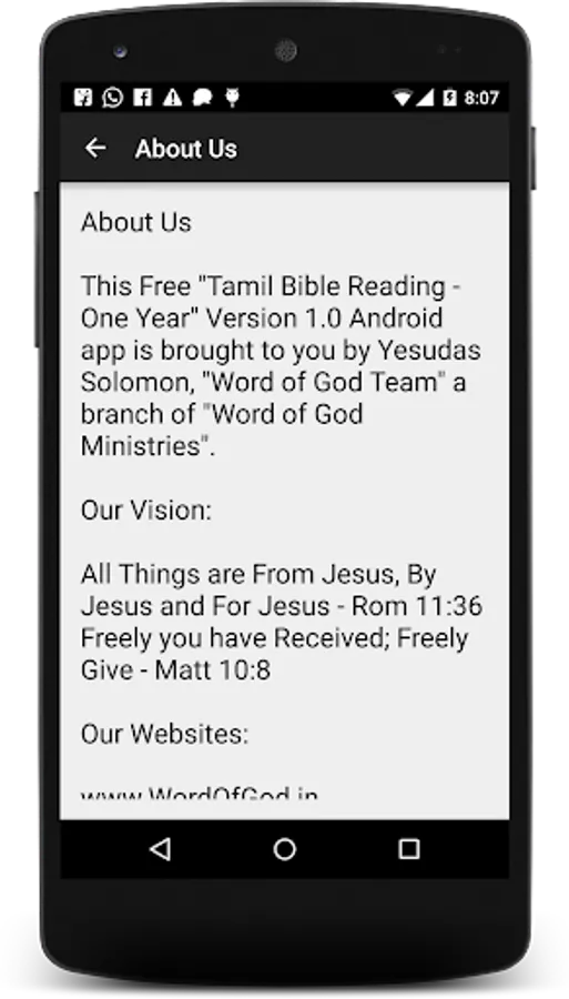 This Free "Tamil Bible Reading - One Year" Version 1.0 Android app is brought to you by Yesudas Solomon, "Word of God Team" a branch of "Word of God Ministries".