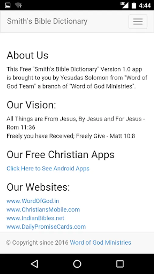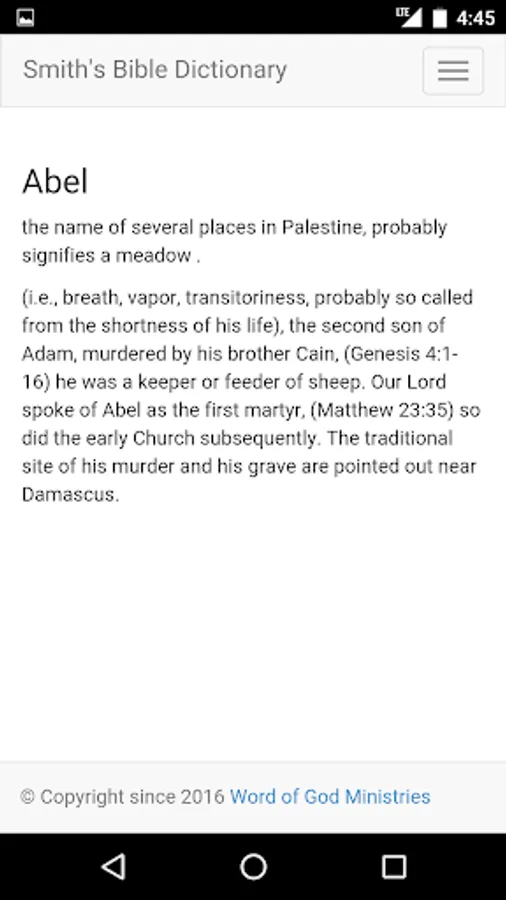 This Free "Smith's Bible Dictionary" Version 1.0 app is brought to you by Yesudas Solomon from "Word of God Team" a branch of "Word of God Ministries".