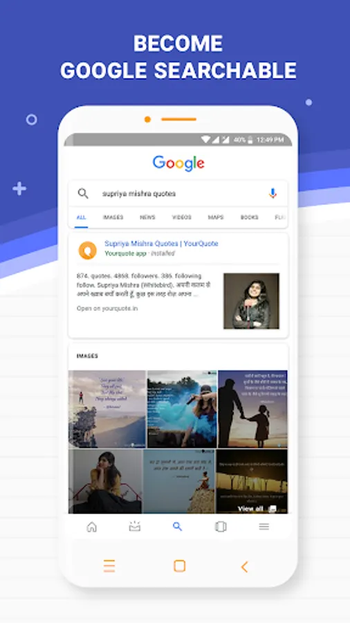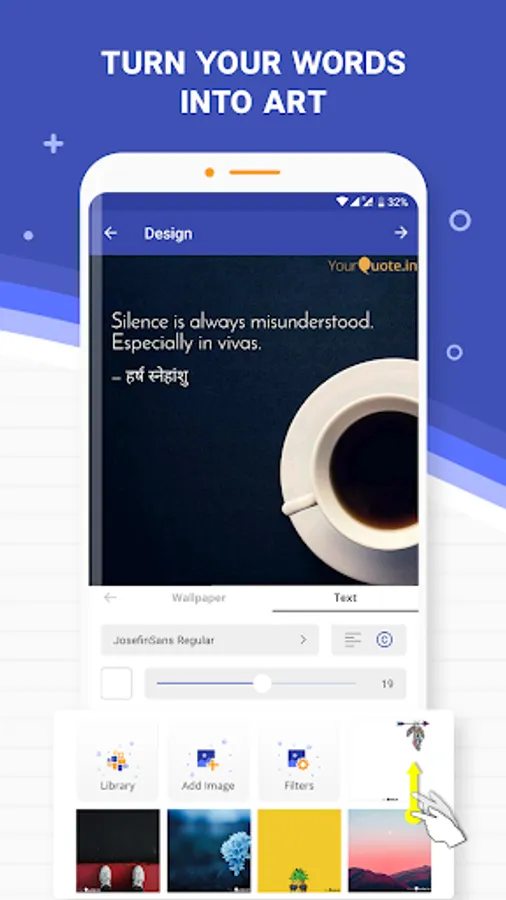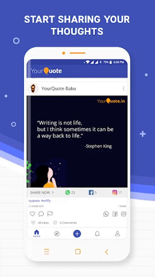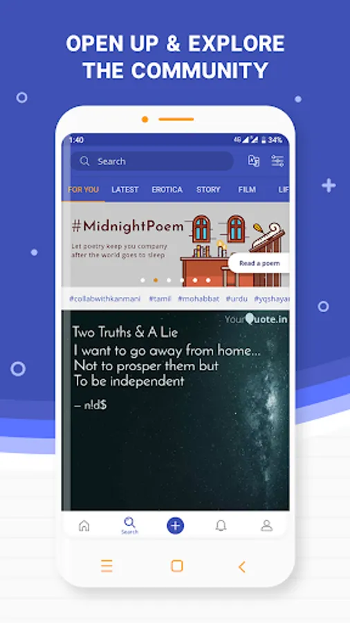 Welcome to YourQuote, the only writing app you'll ever need. Made in India in 2016, YourQuote is currently used by over 5 million writers worldwide in 12+ languages and hosts over 100 million original posts on the platform. With thousands of beautiful wallpapers to broadcast your poems, stories & quotes, YourQuote is an app that's designed to make you fall in love with writing all over again.