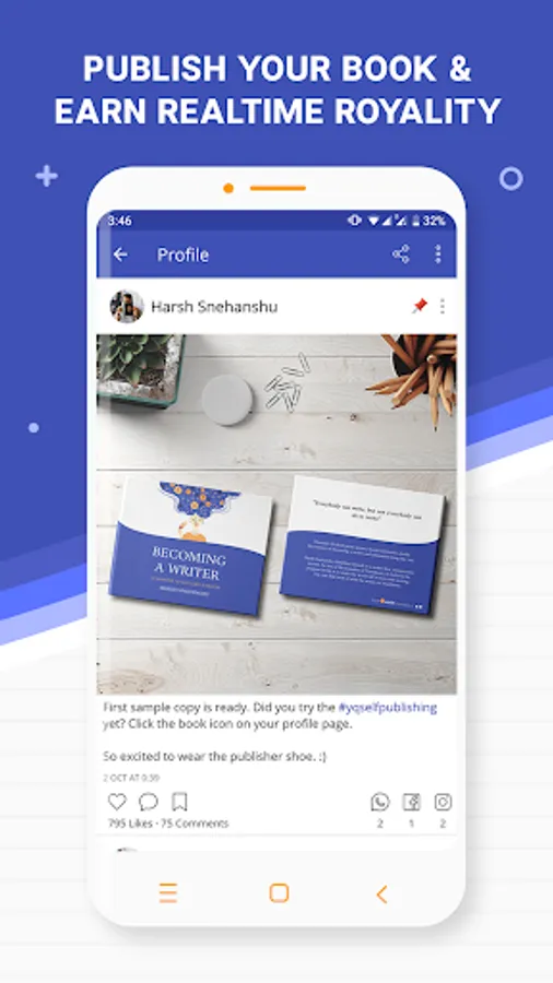 4. PUBLISH YOUR BOOK & EARN REAL-TIME ROYALTY: Once you cross 48 posts, YourQuote unlocks publishing for you. Publish on YQ Bookstore, get a physical copy delivered to your doorstep and earn real-time royalty. Get notified every time someone buys your books and connect with buyers right away. We have short-circuited the publishing process for the world.