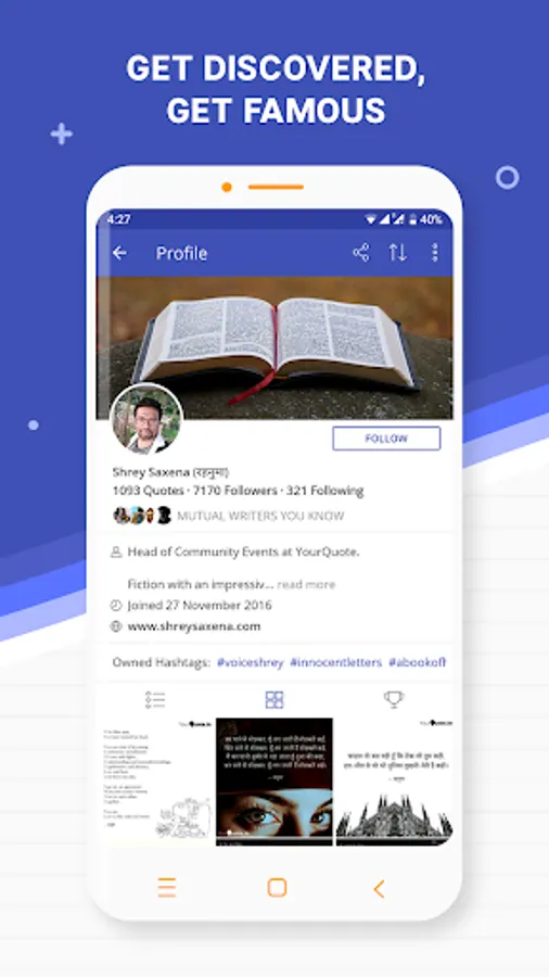 6. FIND WRITER FRIENDS & FOLLOWERS: Befriend a writer and you shall never die, someone wise once said. Imagine a world filled with brilliant writers to follow and make friends with! YourQuote turns your imagination into reality, giving you an access to the finest creative minds at your fingertips. Try the fun collab feature to collaborate with your favourites.