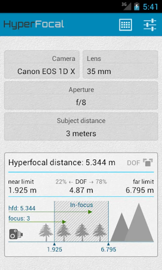 Hyperfocal is your DSLR's perfect companion for on-field photography calculations for hyperfocal distance, depth of field, field of view and more. The must-have tool for the pro photographer to ensure perfect focus & zone of sharpness and keep out the guesswork from focusing to framing.