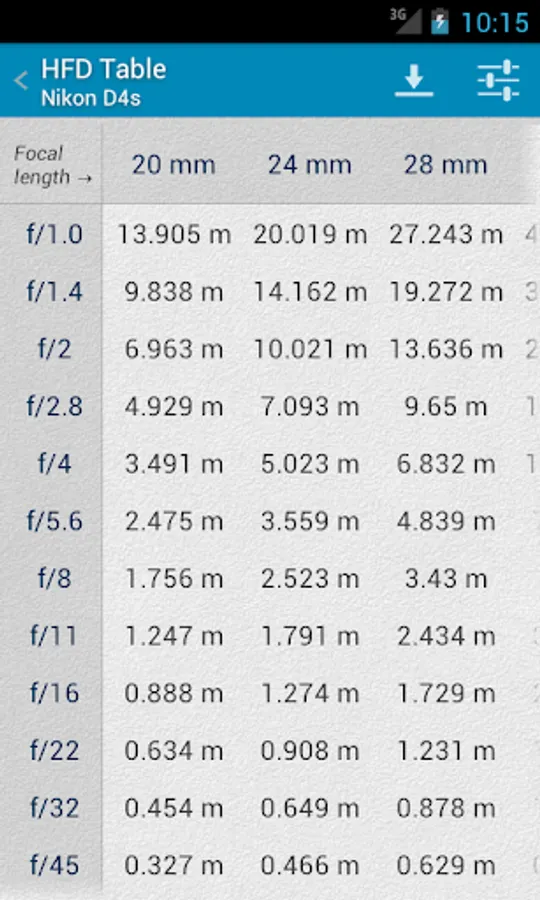 The app can also generates hyper-focal distance table for different f-numbers and lens focal lengths for your camera setup. The app includes a highly configurable hyper-focal distance table generator module to produce customized tables for your camera/lens combinations. You can export hyper-focal distance tables to multiple file formats including html & excel and save/share these for later use.
