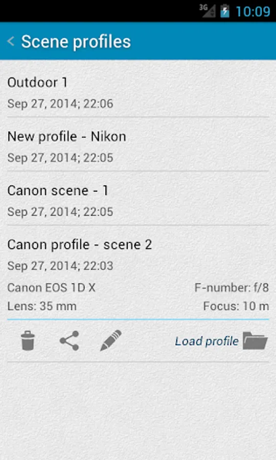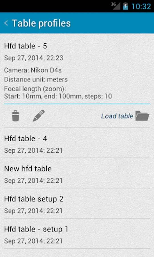There is also has a convenient 'profiles' feature, which let you save/re-load shooting parameters. Profiles let you quickly switch between different camera/lens/shooting parameters combinations to save time while switching between your camera gear. You can also save various 'table profiles' to save hyper-focal distance tables for different set-ups.