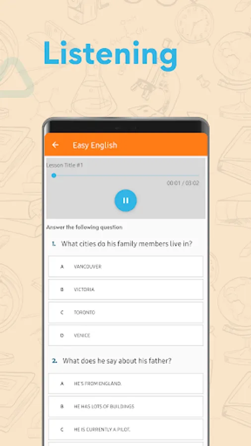 • Listening- Audio books - 75 lessons to listen and answer – improves your English listening skills to the next level