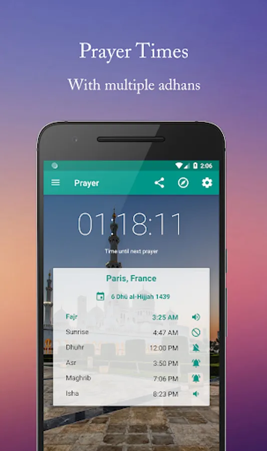 • Notifications at Salat times with the possibility to choose from different athans.