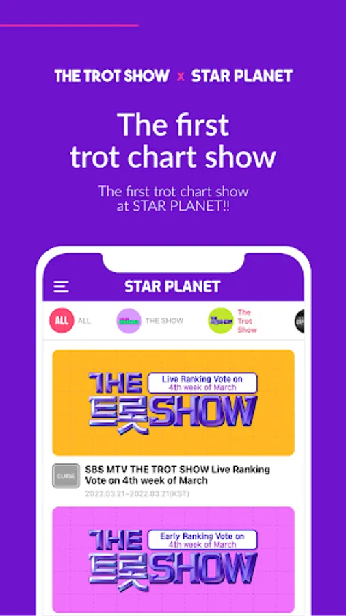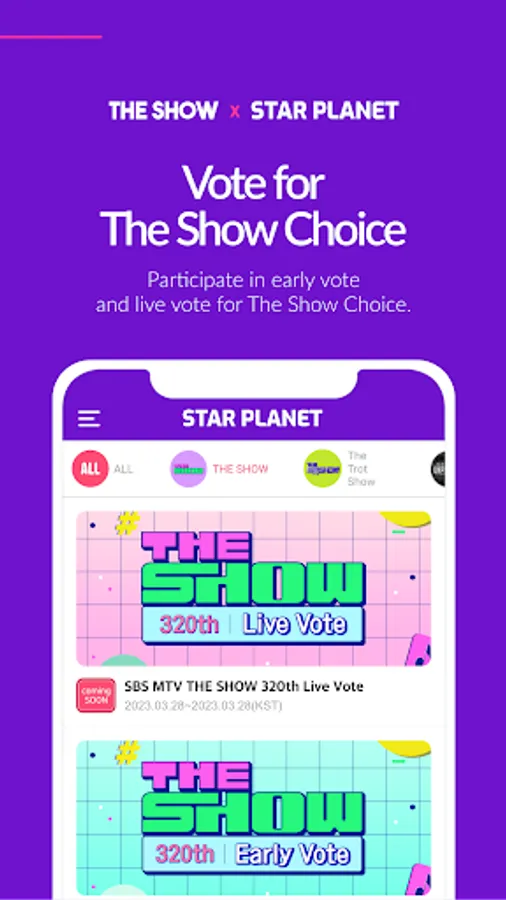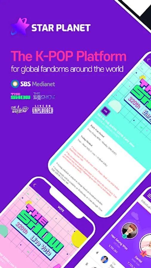 Participate in vote for ‘SBS M THE SHOW’, ‘SBS M THE TROT SHOW’, ‘SBS M LIVE UNPLUGGED’. Vote and make my artist shine like a star!