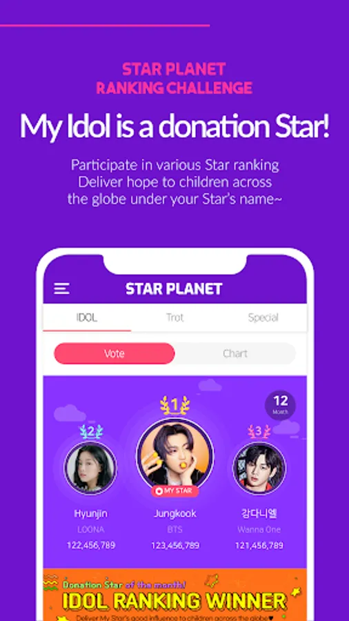 - Various Ranking: Entertaining vote for various IDOL,TROT artist every month. Donation will be made under the name of each winning artist!