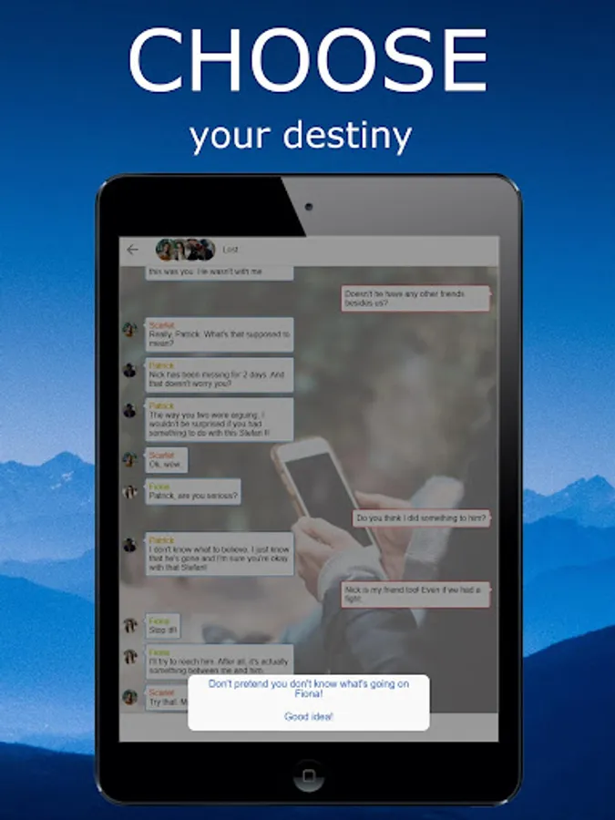 Fiona 's Secret is an interactive chat game. You chat through various chapters and experience an exciting story. Every decision you make will have consequences. Be careful, and become the director of your exciting adventure!