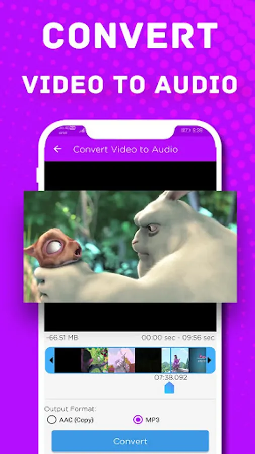 Convert any video into mp3 audio very easily ,Also you can select part of video before convert to music. Convert video to music file to save storage space. Also has option to choose format AAC or MP3.