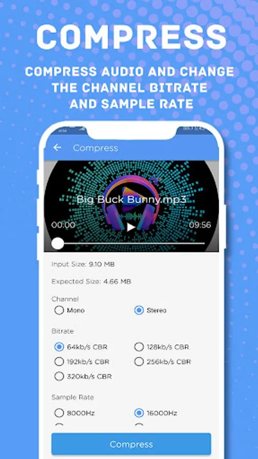 Compressing music lets you to change bitrate, Sample rate & audio channel of your own choice. Also you can able to know the output size before compress.