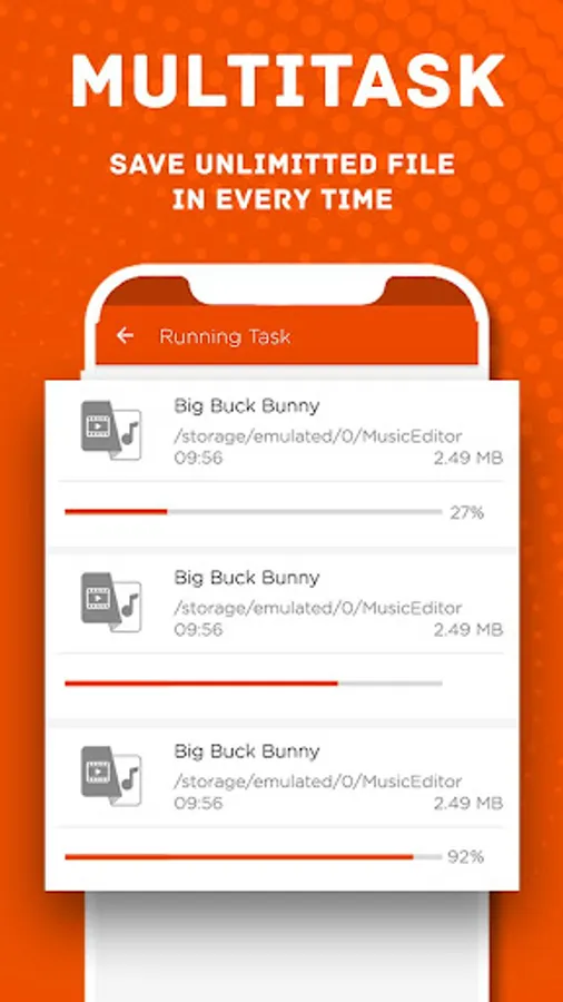 The Best part is that you can view all edited music file on single window & can view progress update of each task you process.Also this app support run multiple task in background. You can get the running task information via notification or Running Task Screen.