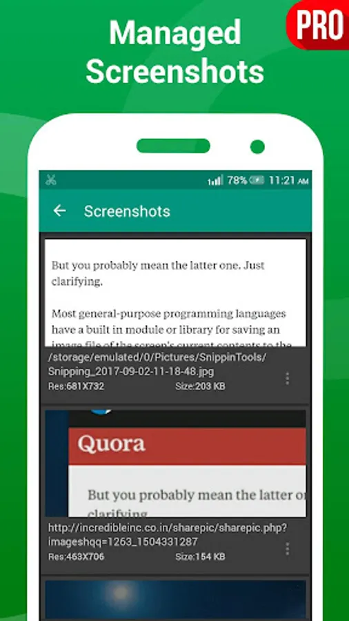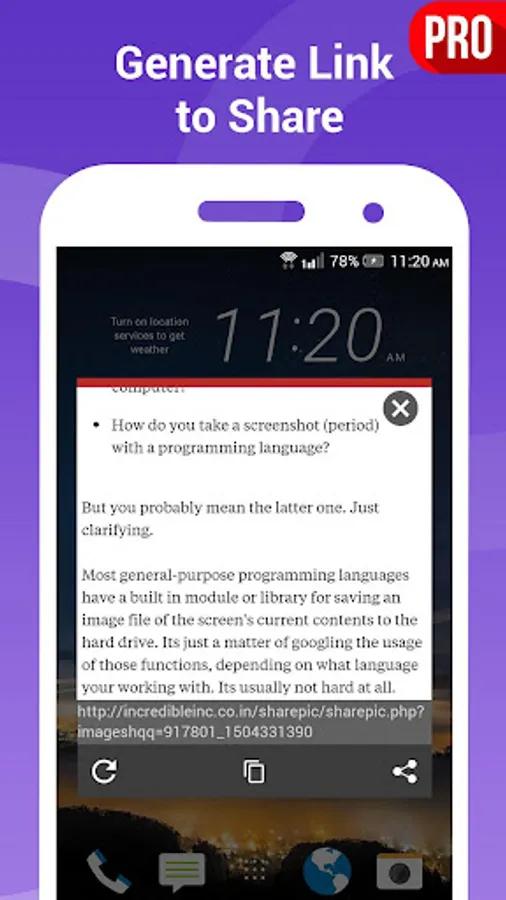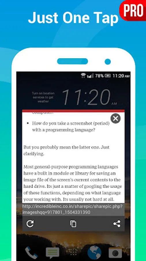 Introducing first app in Android to capture desired part of screen and share generated image.You can take a screenshot quickly without pressing any hardware button, just one touch for screenshot.