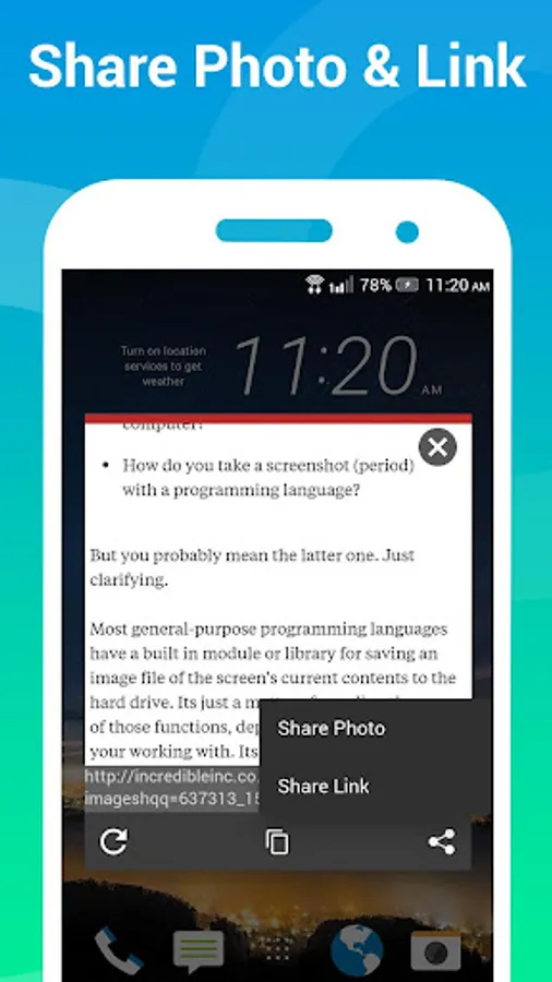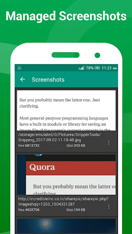 Introducing first app in Android to capture desired part of screen and share generated image.You can take a screenshot quickly without pressing any hardware button, just one touch for screenshot.