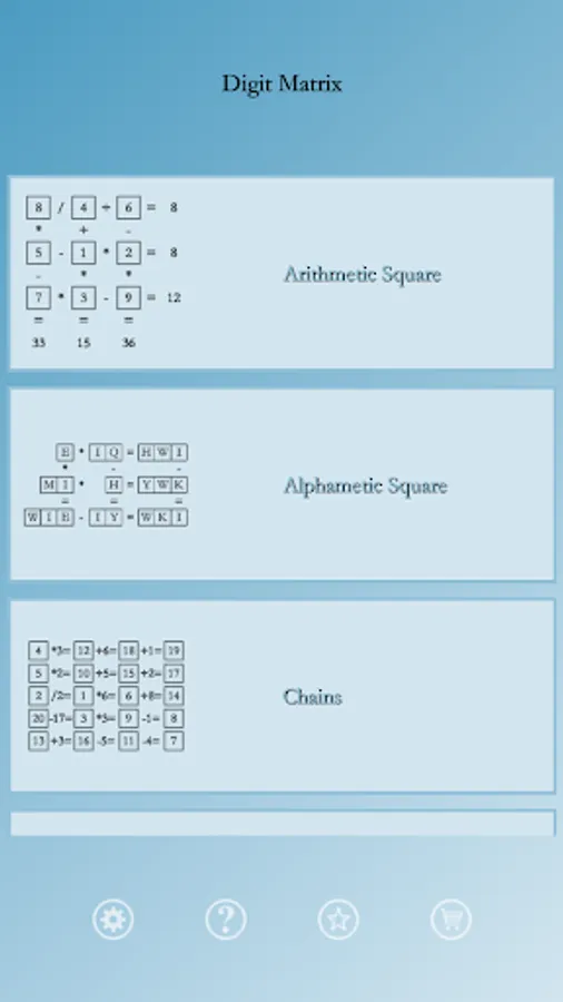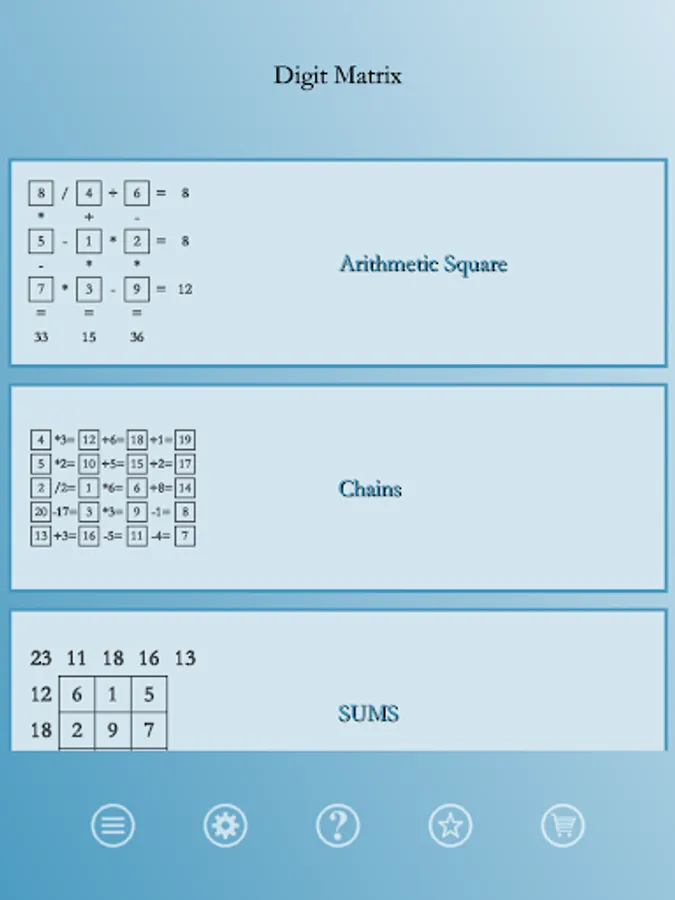 Digit Matrix is a collection of interesting mathematics exercises. This APP can improve the ability of calculation and logical reasoning, and cultivate mathematical thinking. It includes topics ranging from simple to very difficult. It is a good helper in learning mathematics or training the brain.