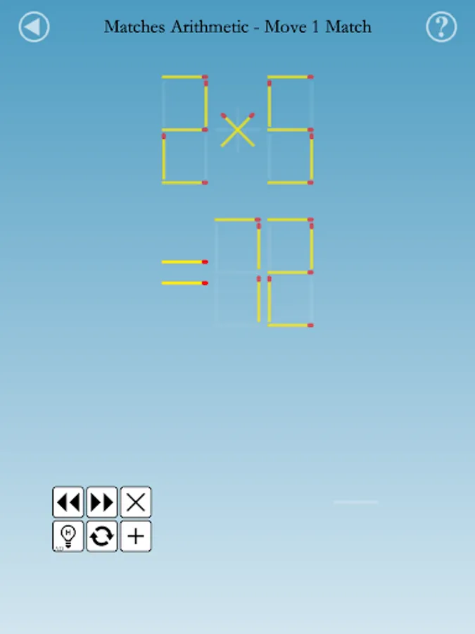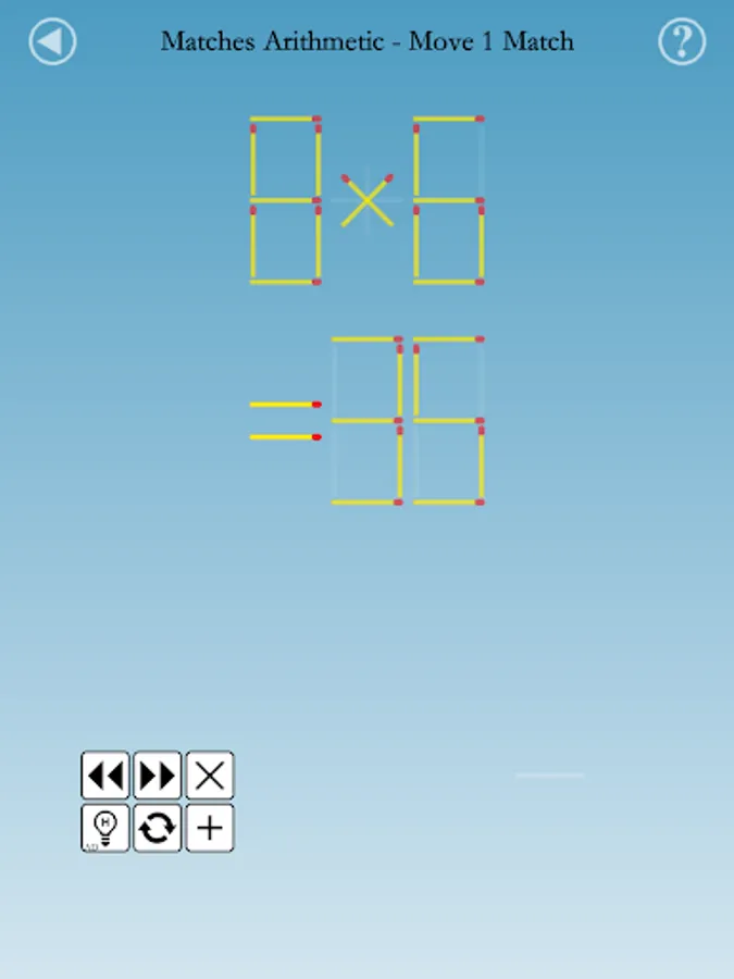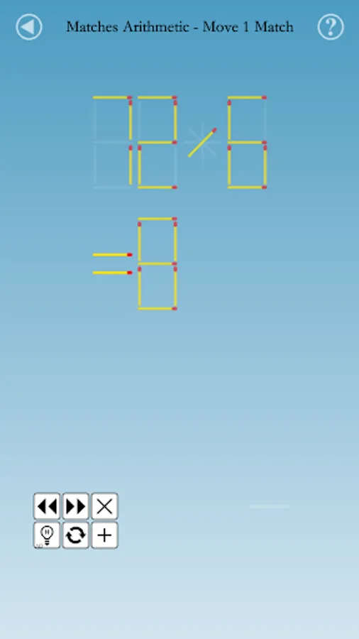 Remove, Add or Move one to three matches so that the matches express a correct arithmetic equality. Click the match to remove it. Click the empty position to add the match.