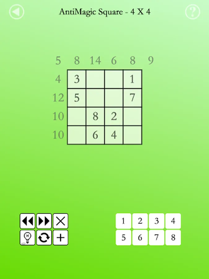 Place numbers from 1 to 2*N (N is the number of cells per side) into some cells so that each number is in exactly one cell, and no cell has more than one number. Each row and each column must contain exactly two numbers. Numbers outside the grid are 1 more or 1 less than the product of the two numbers in that row or column.