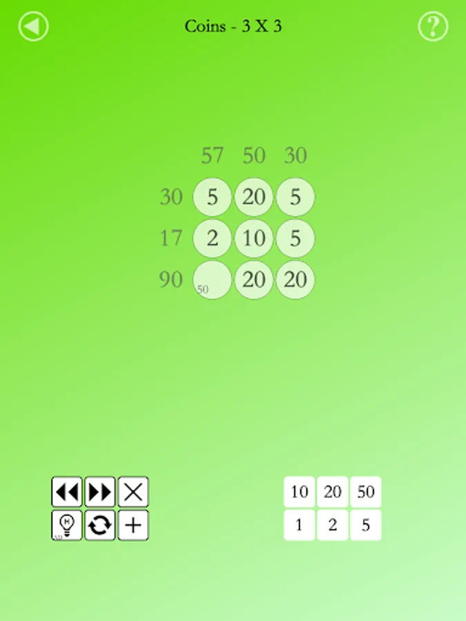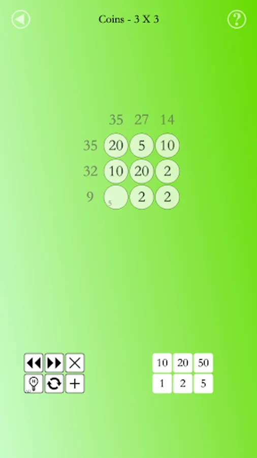 Place one coin into each cell such that the sum of the coins in each row and column matches the number to the left and the top. the same denomination may be used multiple times in each row or column.