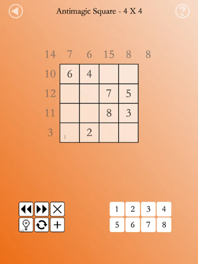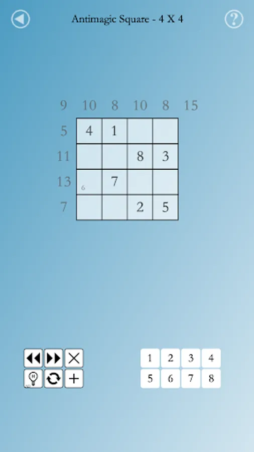 Place numbers from 1 to 2*N (N is the number of cells per side) into the cells so that there are exactly two numbers in each row, column and main diagonal. The sums of the two numbers are shown around the grid.