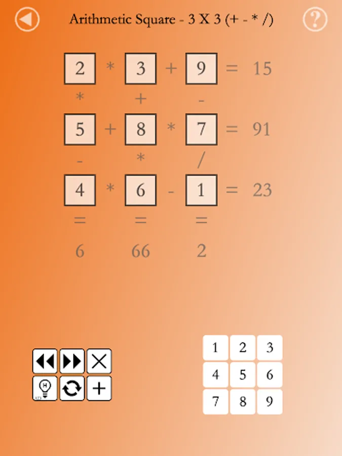 Place the numbers from 1 to 9 into the cells (a different single number in each cell) so that the indicated equations are correct. Evaluate from left-to-right and top-to-bottom (ignore the usual precedence of the operators).