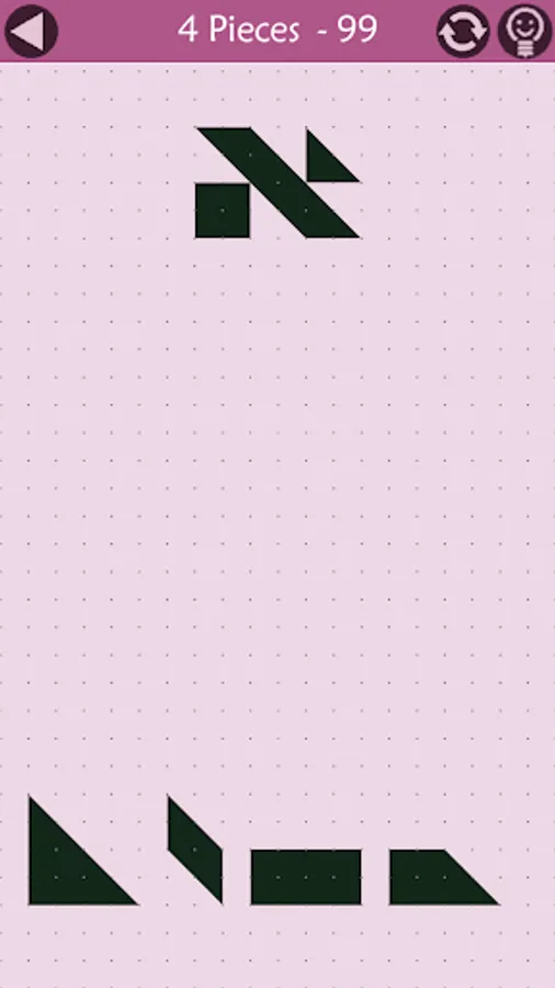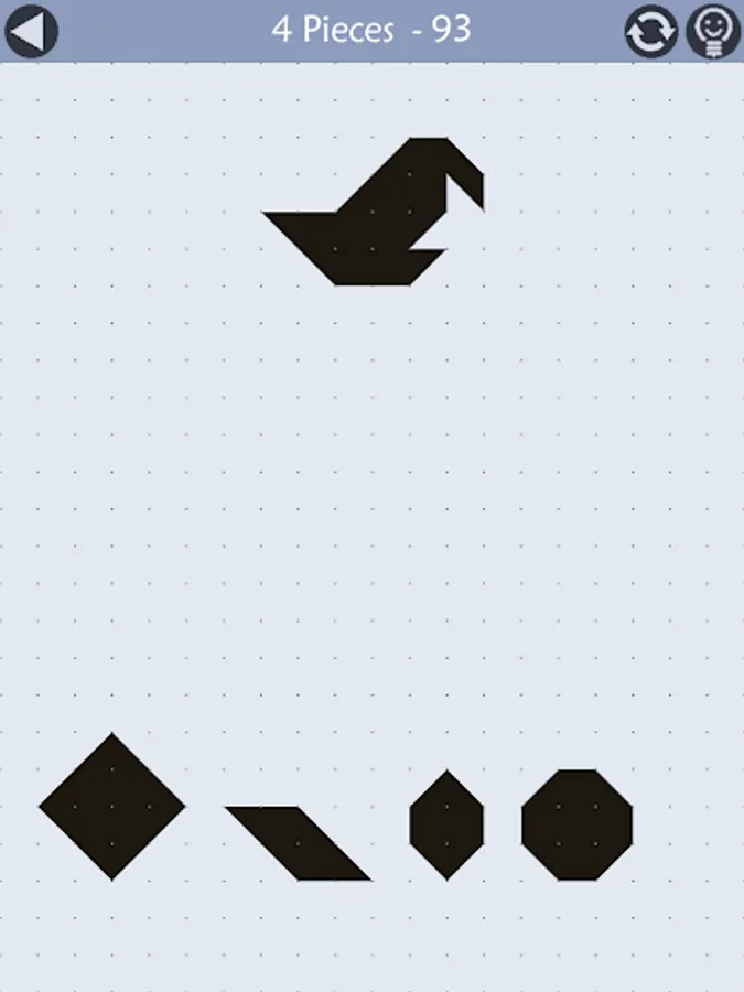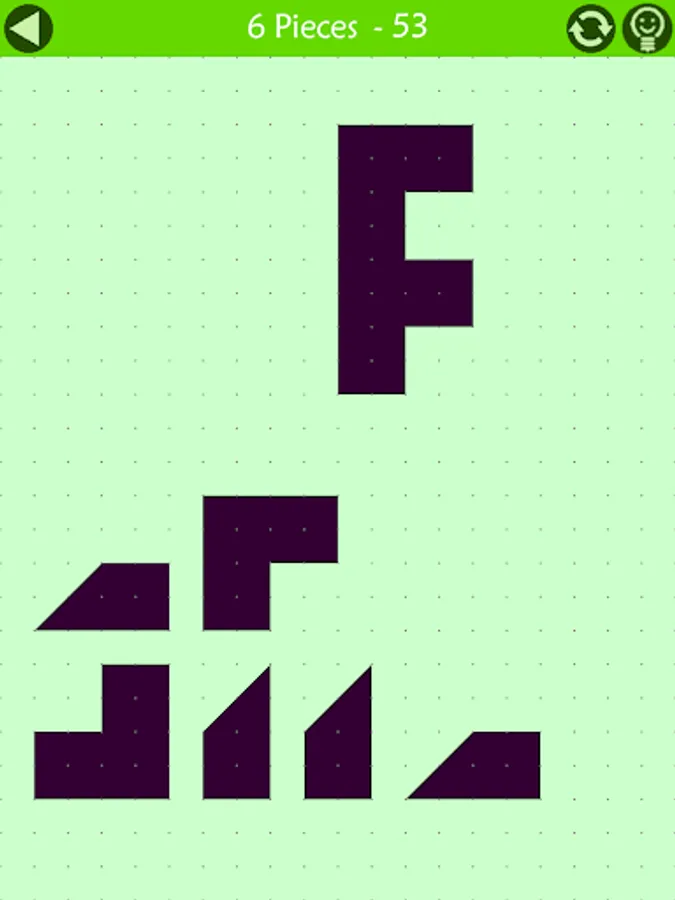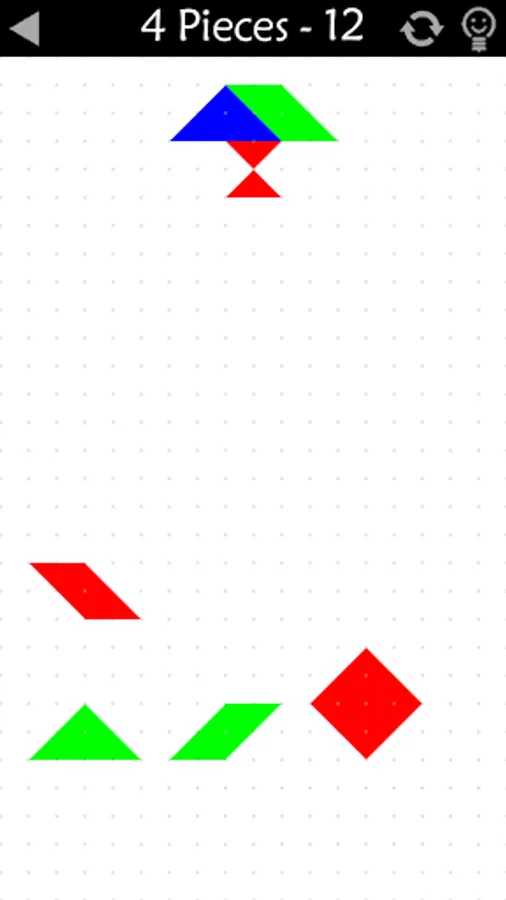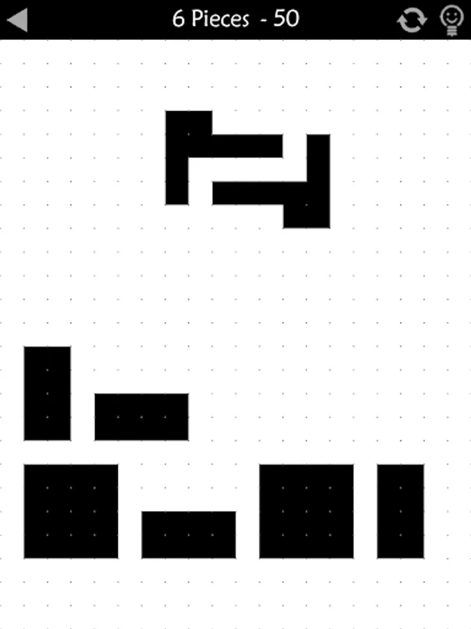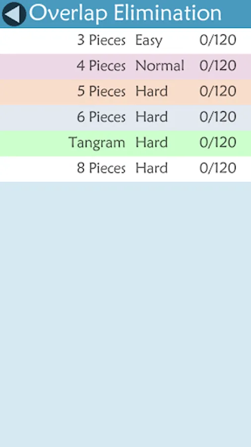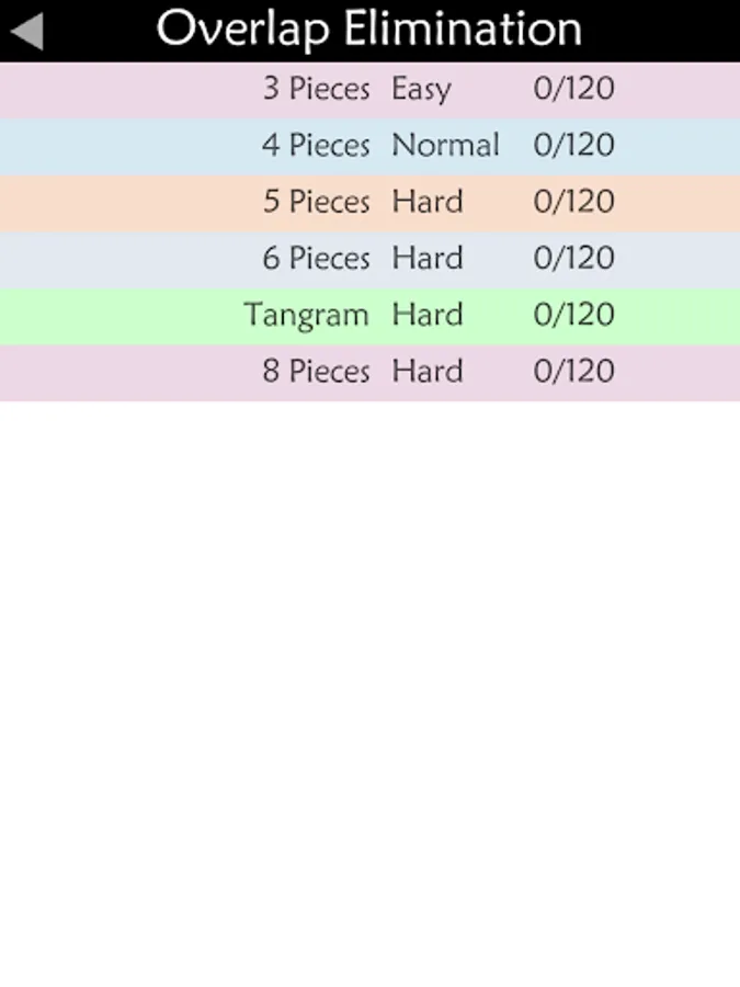 Overlap Elimination is an interesting puzzle game. The objective is moving the pieces to make the same shape showing on board. The rule is: When even number pieces are overlapping, the overlapped part will be eliminated and display background(Black + Black = White). In Tricolor mode, when two different color pieces are overlapping the overlapped part will show another color(Red + Green = Blue).