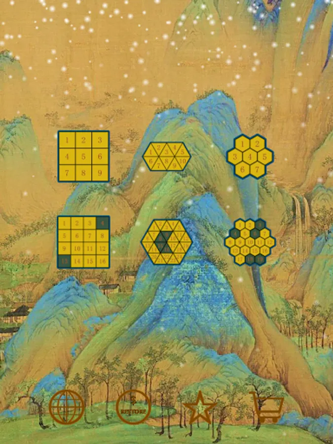 This APP extended the classic Fifteen Puzzle to triangle and hexagon. Added fixed blocks and irregular board mode. There are THREE modes, THREE shapes. Each have SIX difficulty level.