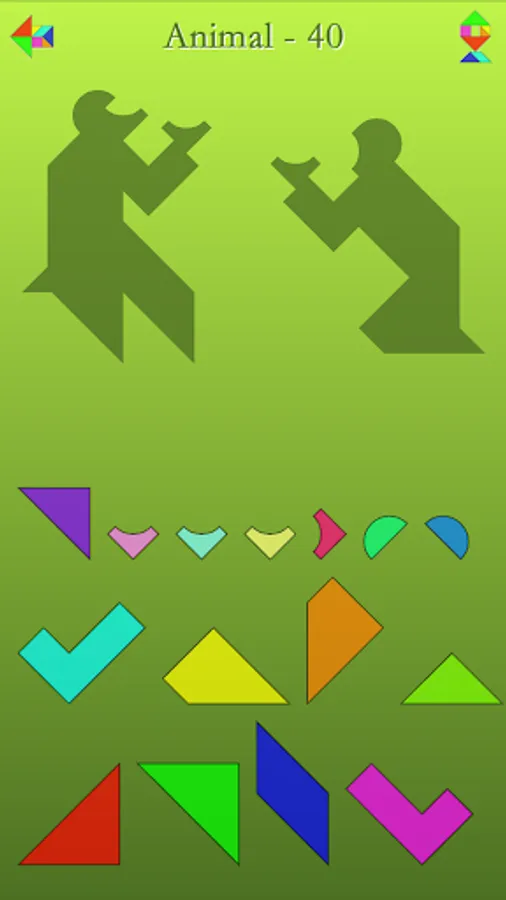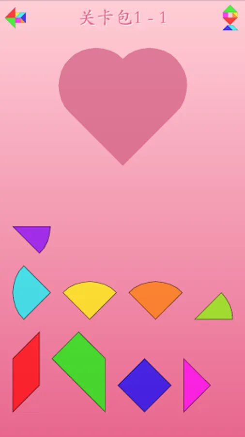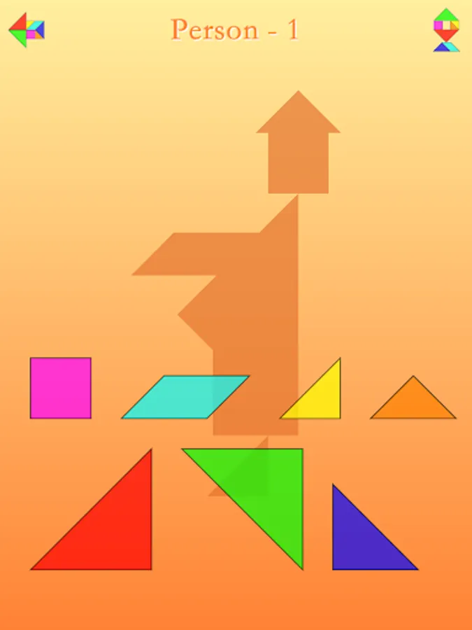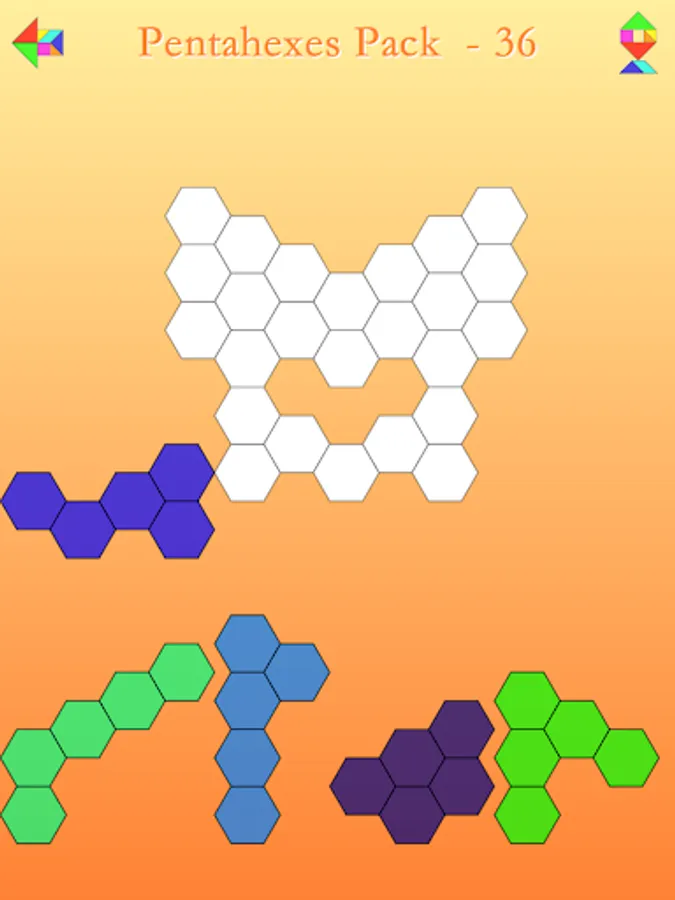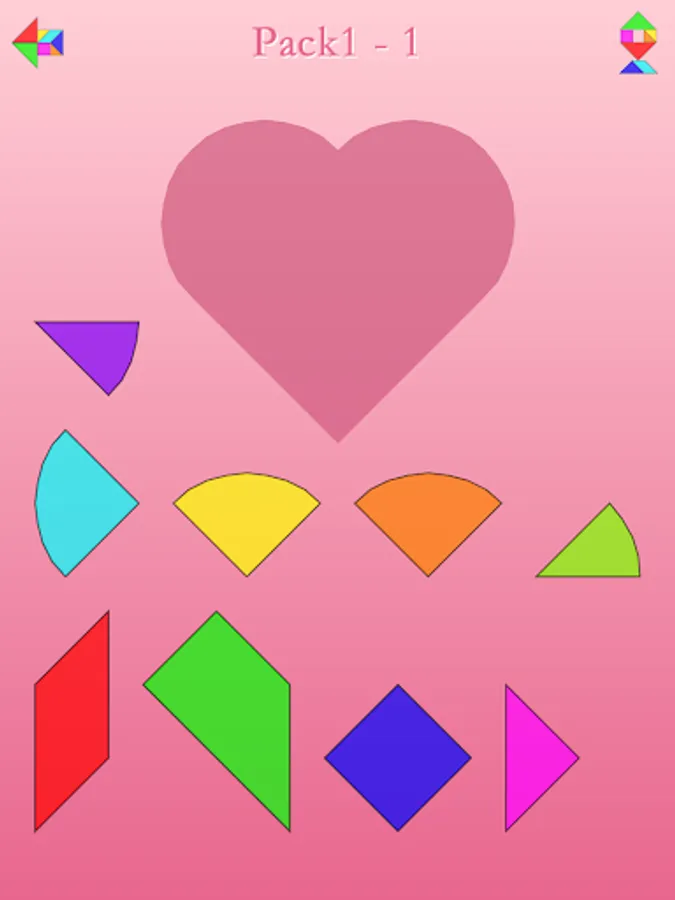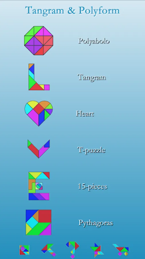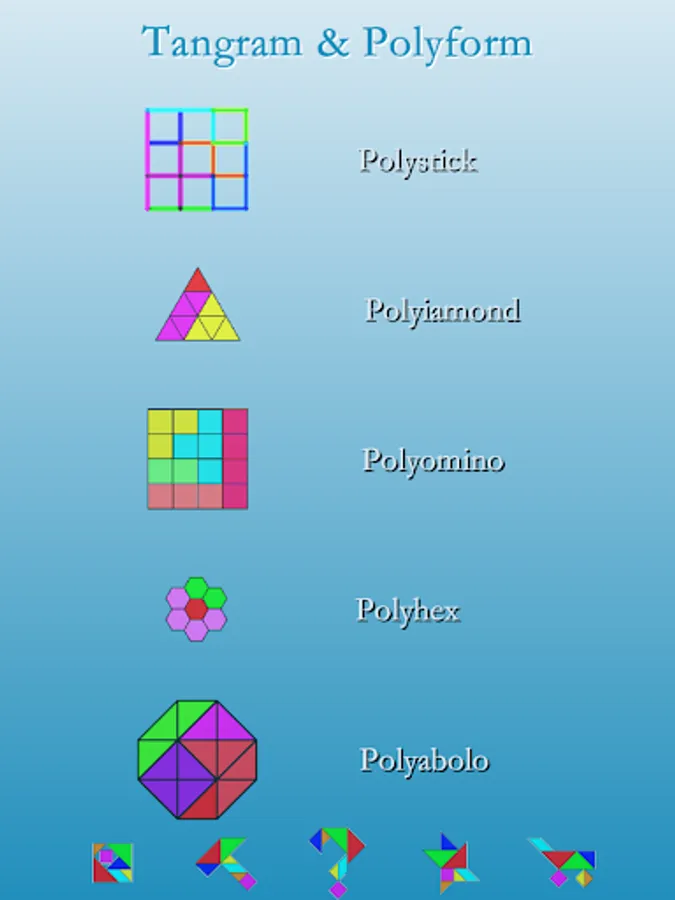 This puzzle game contains nine types of tangram puzzles and six types polyform puzzles.