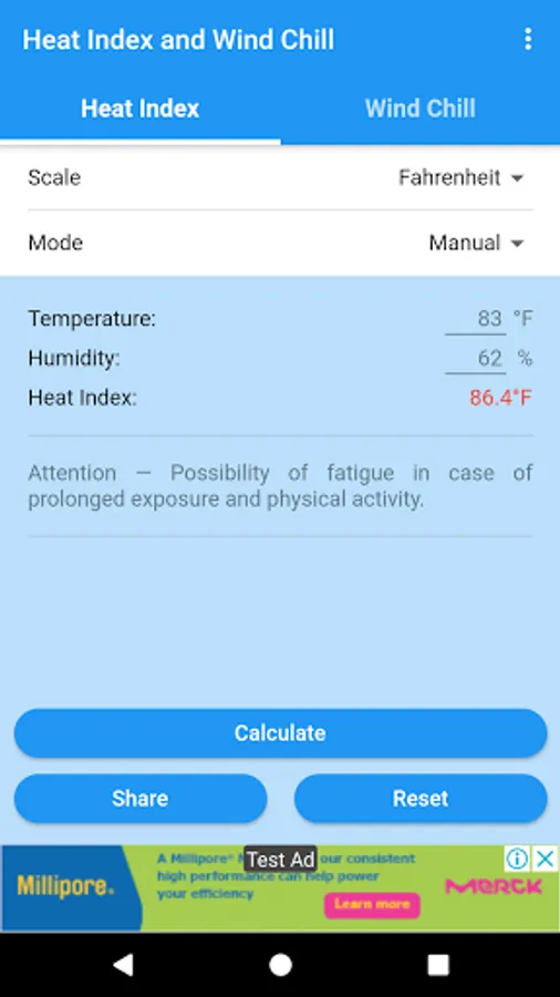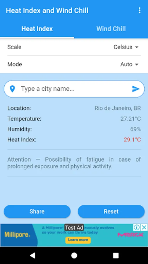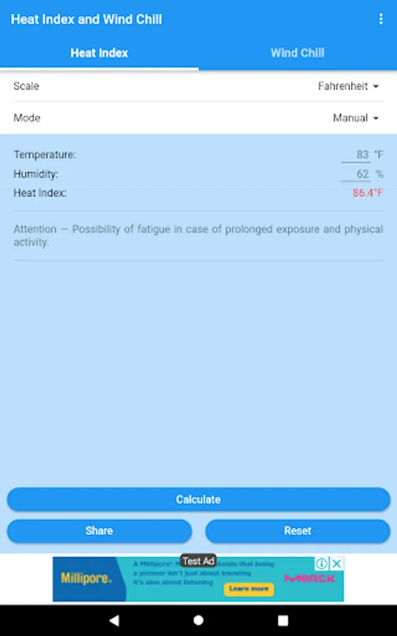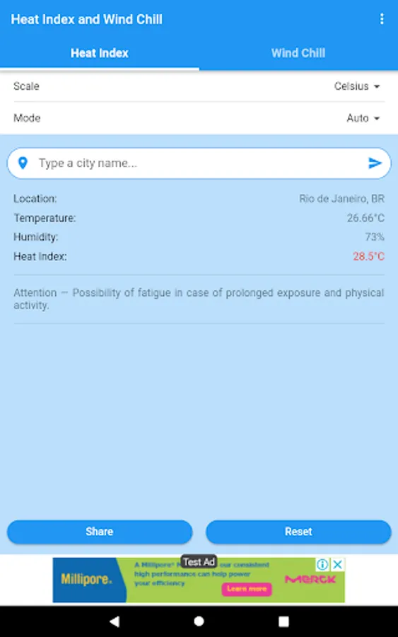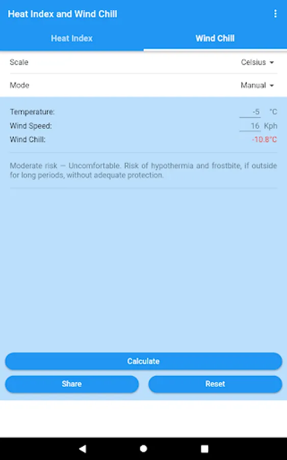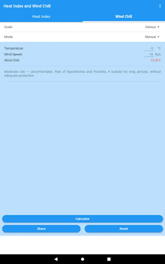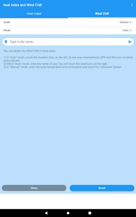 You can obtain the Heat Index and the Wind Chill in Celsius or Fahrenheit, and share the results by SMS, e-mail, WhatsApp, etc.