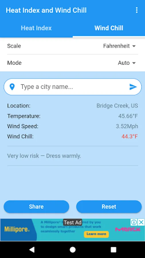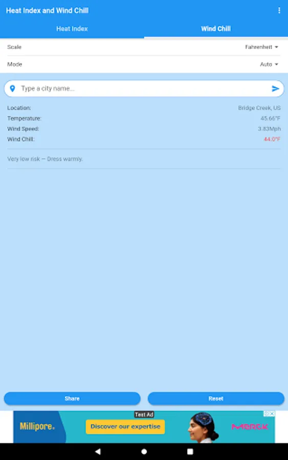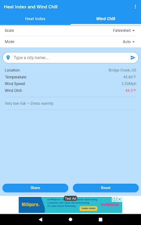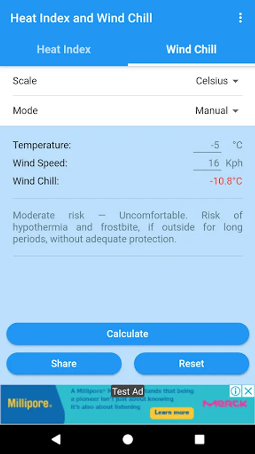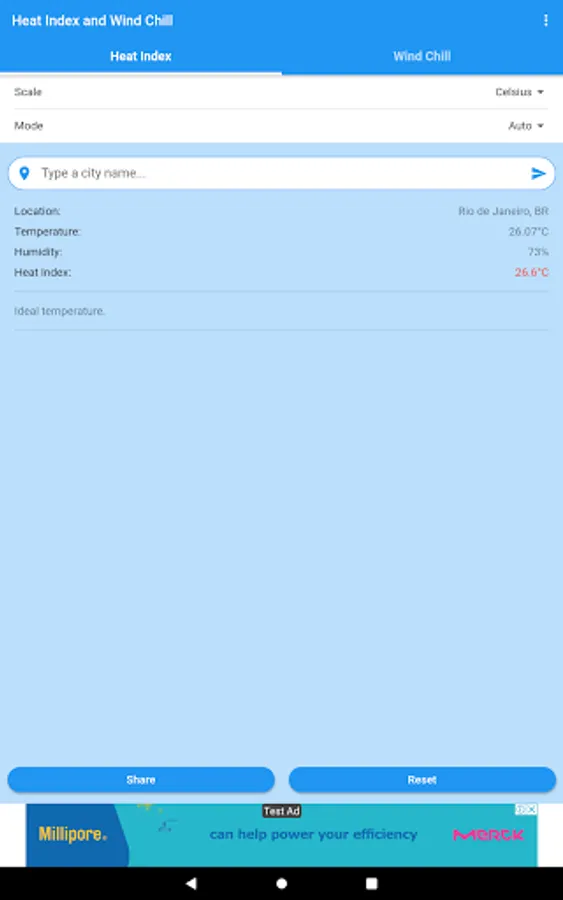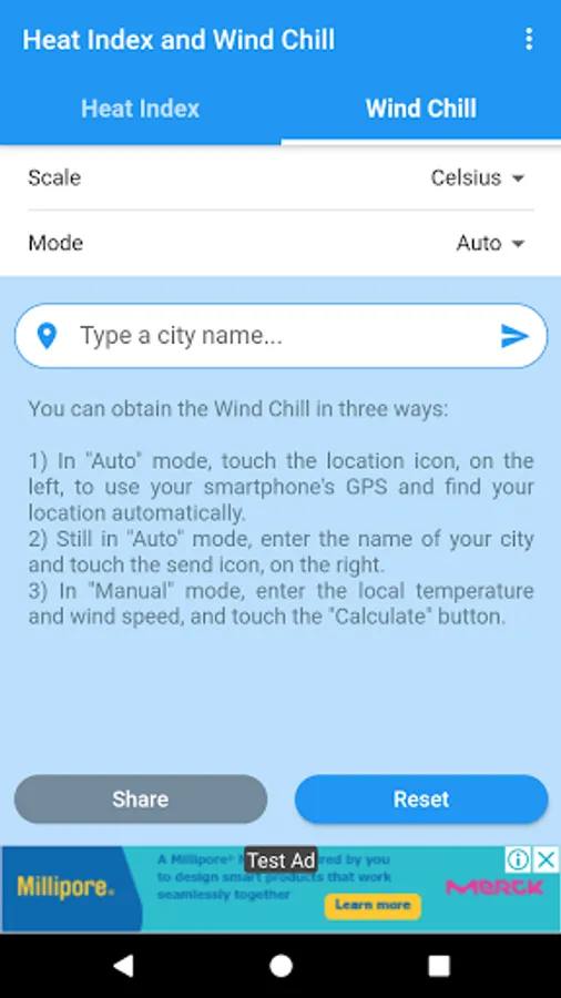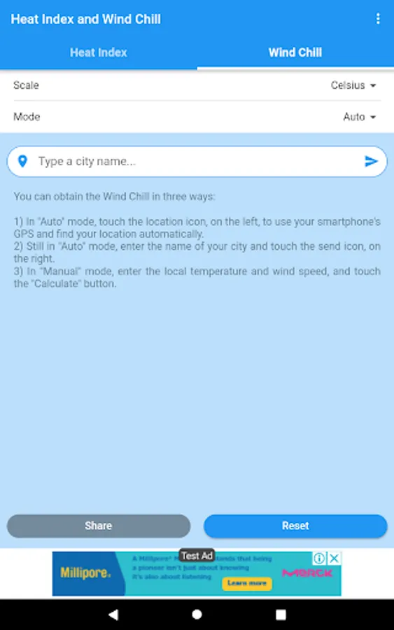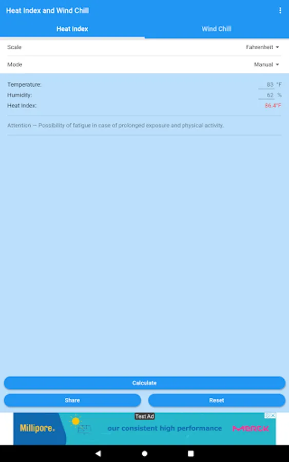 You can obtain the Heat Index and the Wind Chill in Celsius or Fahrenheit, and share the results by SMS, e-mail, WhatsApp, etc.