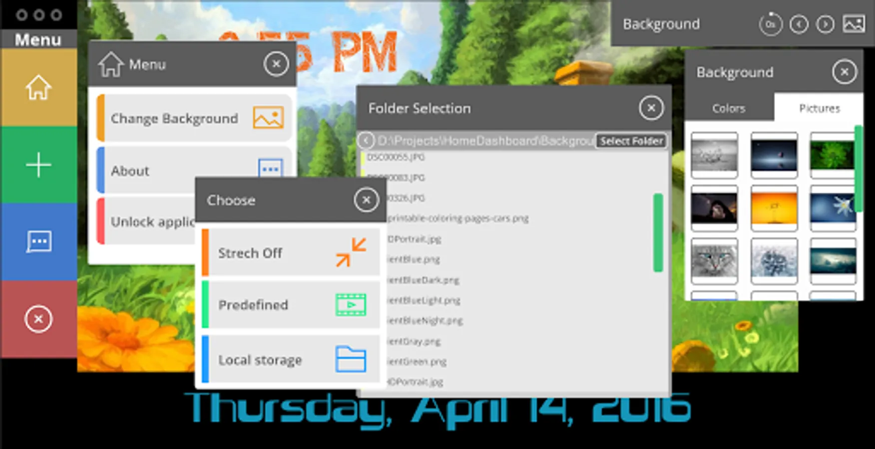 All windows can be customized to show different backgrounds from a list of predefined backgrounds. The text type and color can be also changed depending on your preferences.