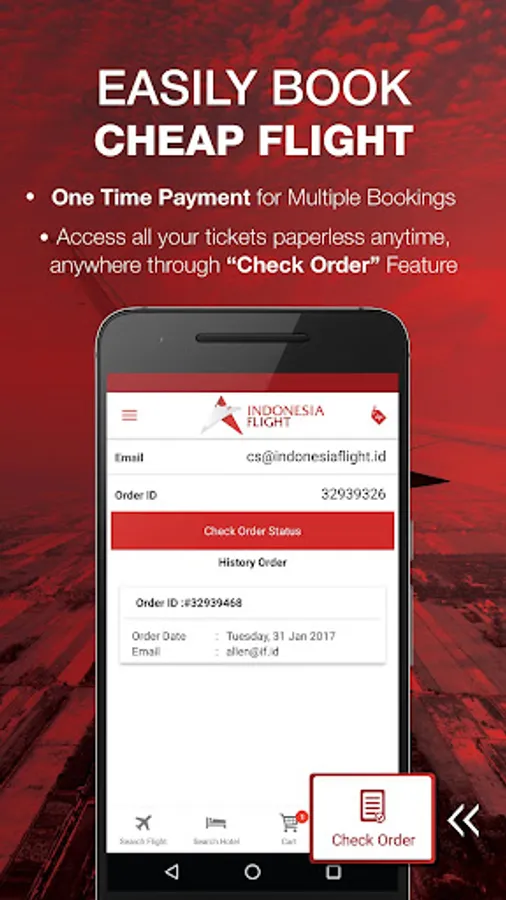Try our fast multiple flight booking process with only one time payment. Travel in comfort by utilizing our “Check Order” feature. No need to trouble yourself by printing and safekeeping hardcopy ticket, You can access all your tickets paperless anytime anywhere through Indonesia Flight app.