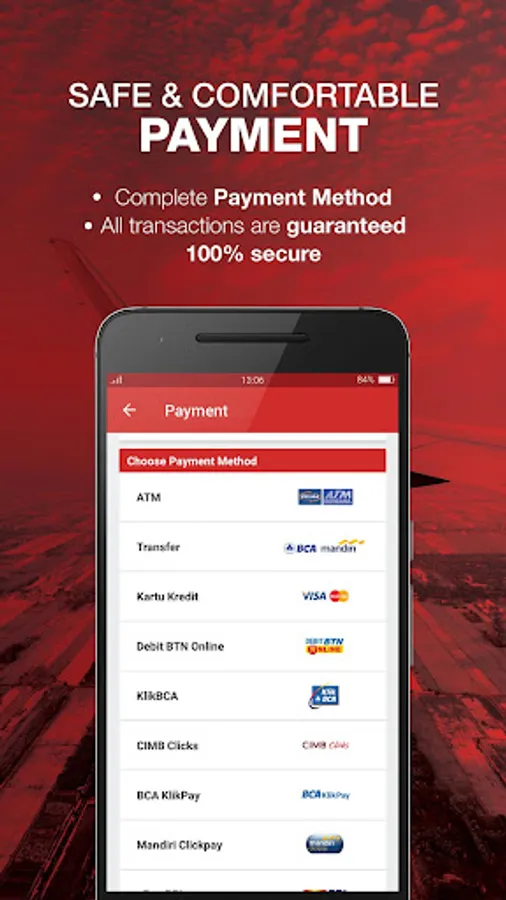 Indonesia Flight provide complete payment method and guaranteed 100% secure for your comfort. Available payment method are ATM Transfer (ATM Bersama) for all Bank, Credit Card, Online Transfer & M-Banking BCA & Mandiri, Debit BTN Online, KlikBCA, BCA Klikpay, CIMB Clicks, ePay BRI and Mandiri Clickpay.