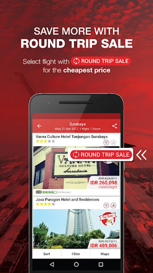 Get the best price for roundtrip flight by selecting flight with Round Trip Sale icon.