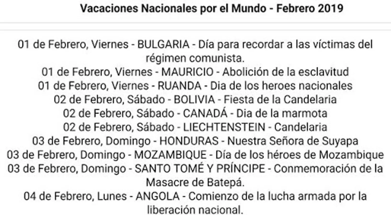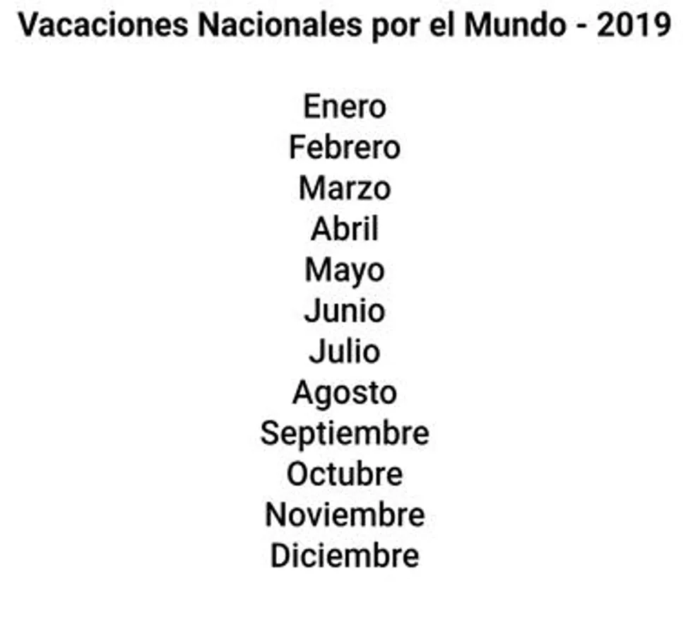 A list of National Holidays around the World for the year 2019. It is possible to observe holidays in more than 220 countries and also occurrences in a given month.