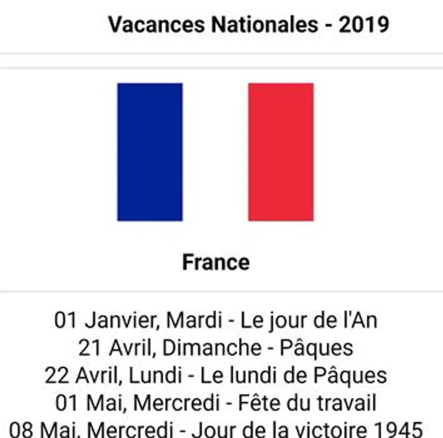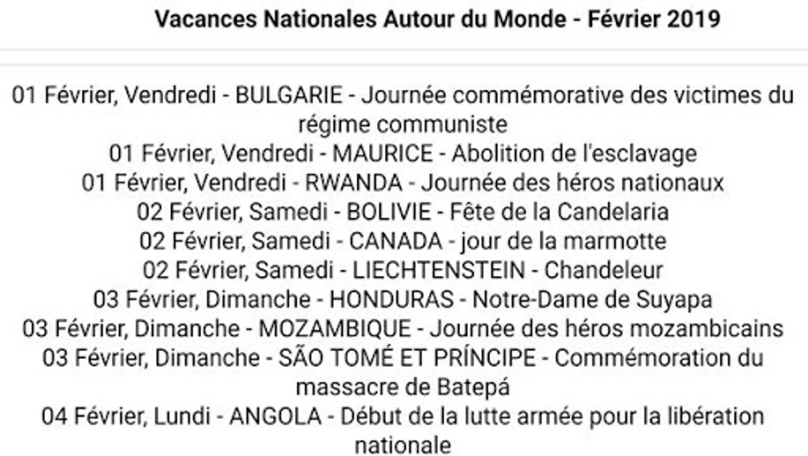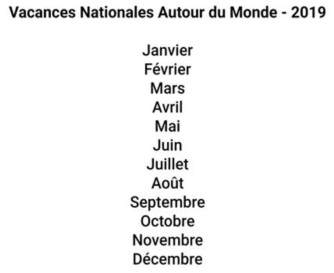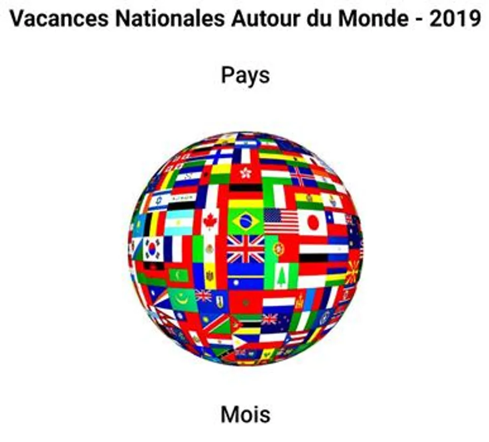 List of holidays around the world for the year 2019. It is possible to observe the holidays of more than 220 countries and their occurrences a given month.