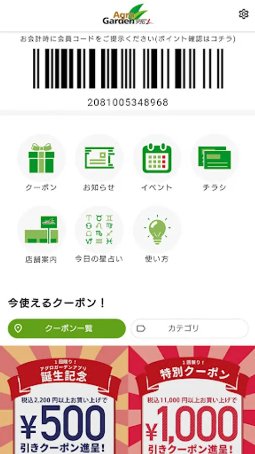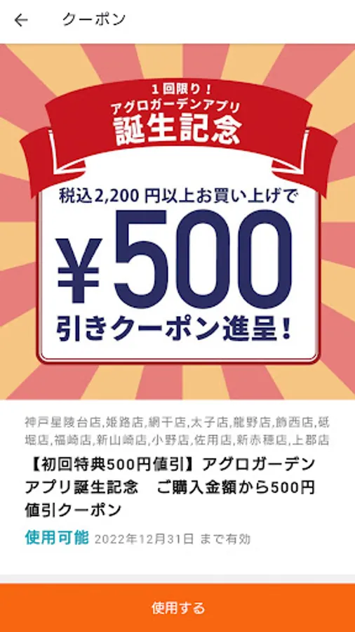 The Agro Garden official app is a coupon app that provides valuable information such as discount coupons, gift coupons, and special card grant point coupons that can be used at Agro Garden to make your life in Hyogo prefecture richer and smarter. ..