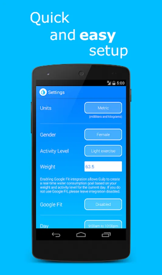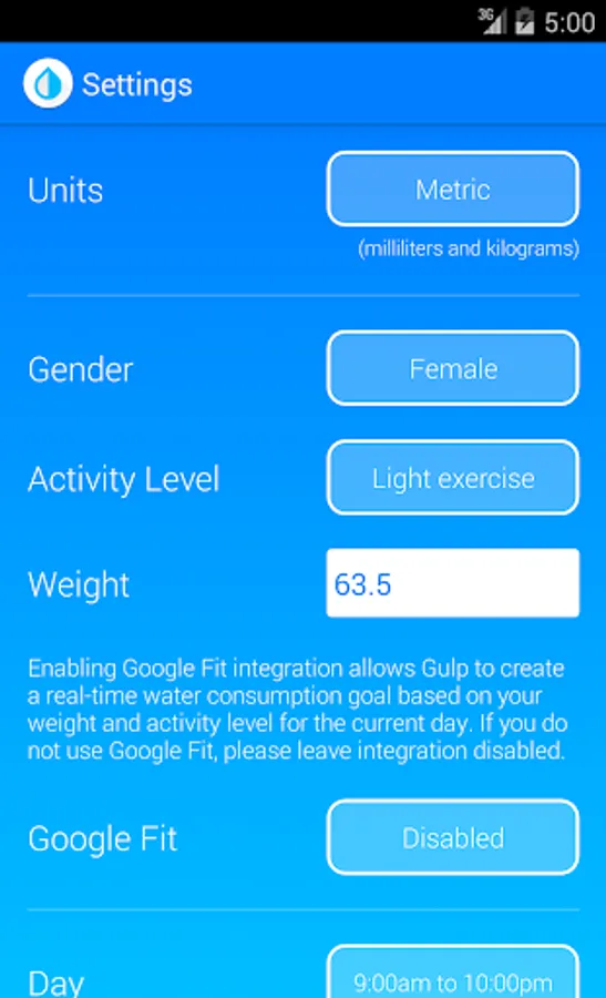 Of course, if you do not use Google Fit, you can manually specify your amount of daily activity and Gulp will pad your daily water consumption goal with a fixed amount of extra water!