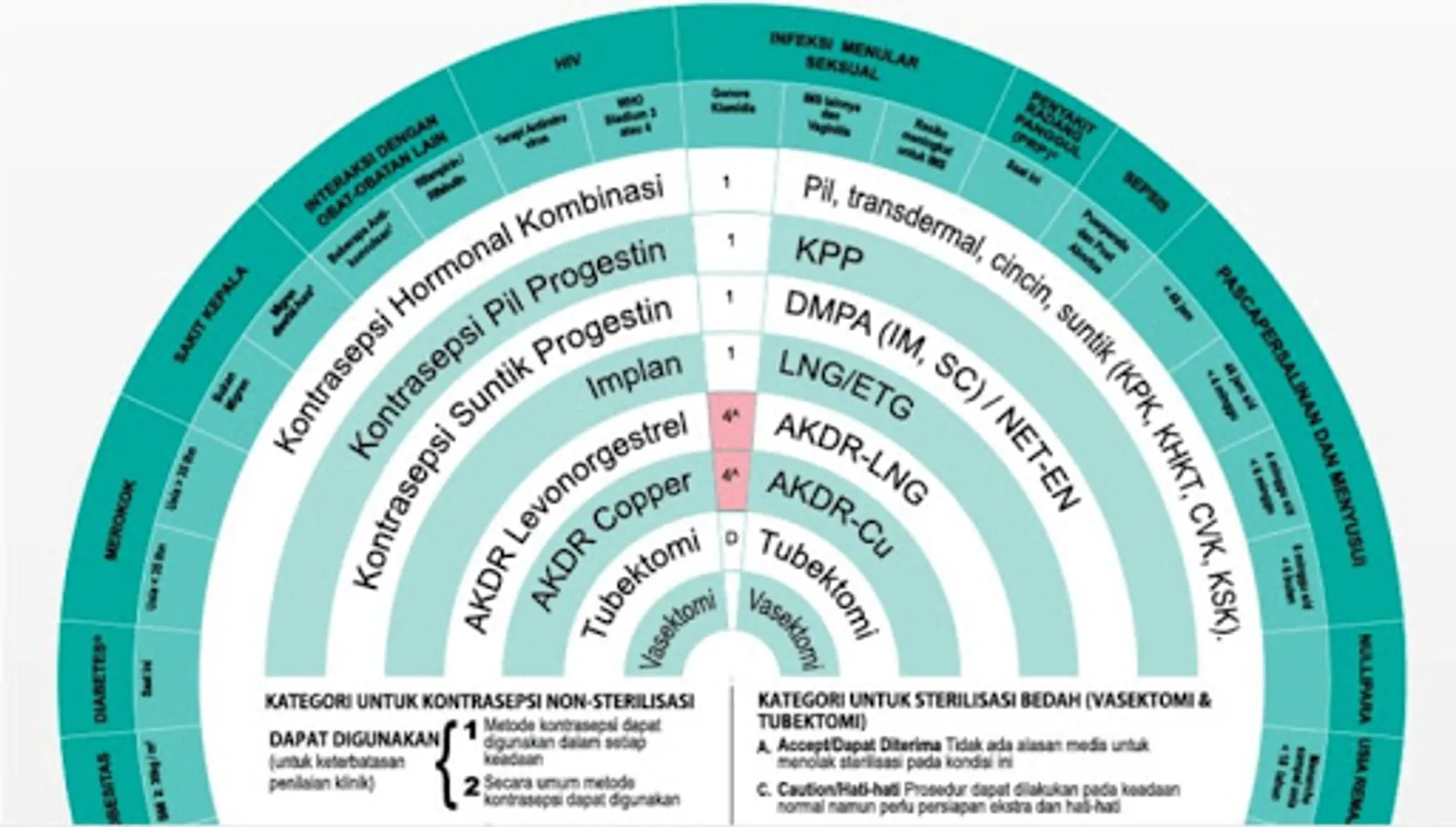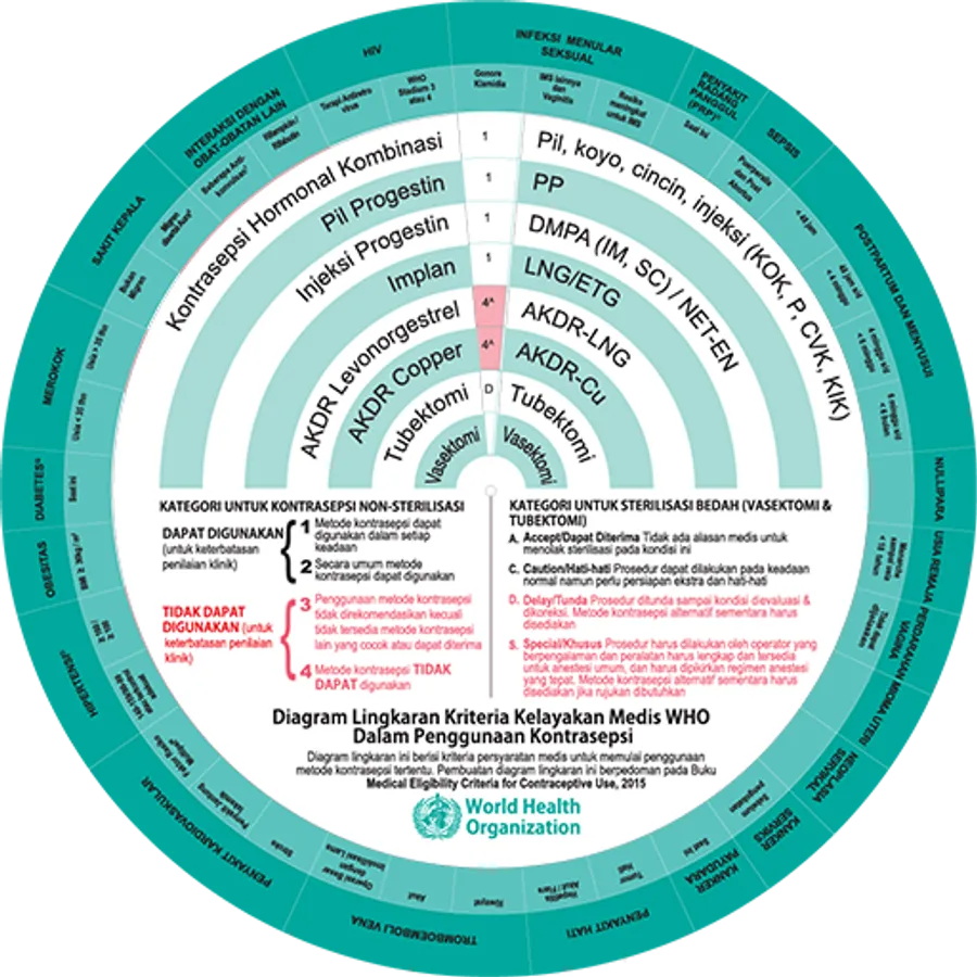 Diagram lingkaran ini merupakan modifikasi dari hasil publikasi resmi WHO yaitu Medical Eligibility Criteria for Contraceptive Use, 2015 (Department of Reproductive Health and Research, 2015).
