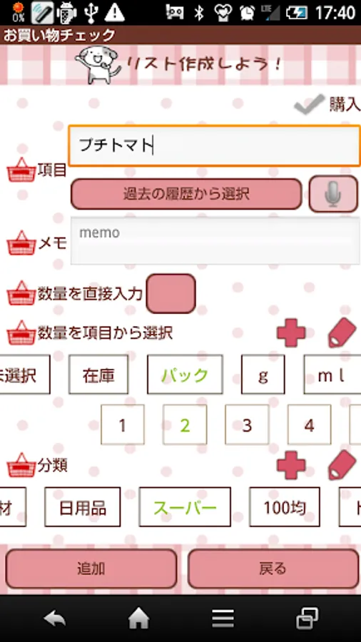 3 When you move to list making screen (Make A List!), enter an item or select it from the past registration.