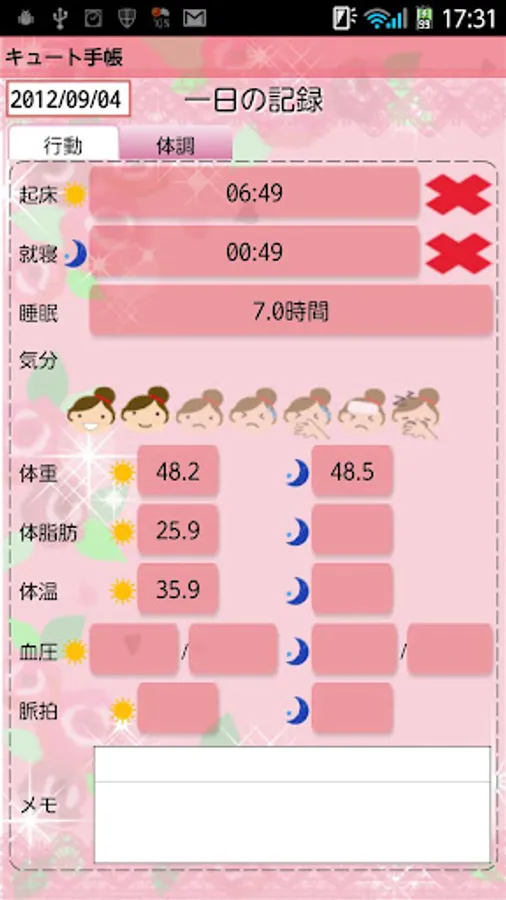 You can save, Wake-up time/Bed time/Sleeping hours/Conditions(face icons)/Weight/Fat rate/Temperature (the basal body temperature)/Blood pressure/Pulse and Memo.