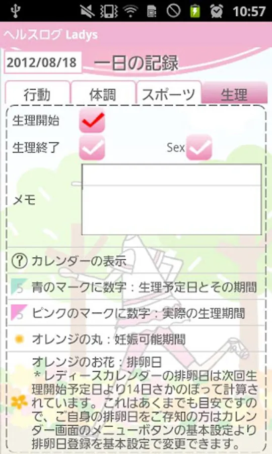 3. Day of ovulation: it is different with each person. HealthLog Ladys sets the ovulation 14days back from the next period but this is just a reference. If you know the exact ovulation day, please set the day here.