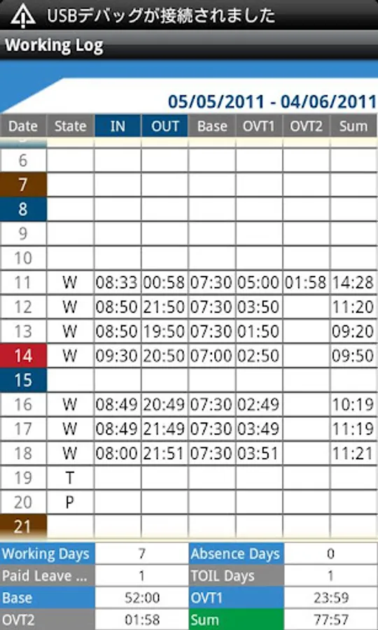 1. Tap "Time Card" button on the calendar, then move to the Time Card screen. Working Days, Absence Days, Paid Leave Days, TOIL Days, Base, Overtime (OVT1 & OVT2), and Sum will be displayed in the list so you can track the attendance records at one view.