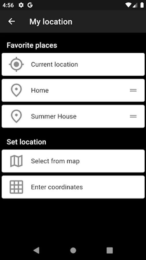 - Input your location automatically by GPS, select from a map or enter coordinates manually.