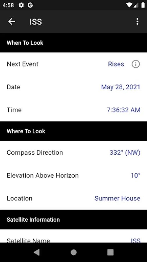 - Rotate your device to landscape orientation to show exactly where the satellite will pass in the night sky.