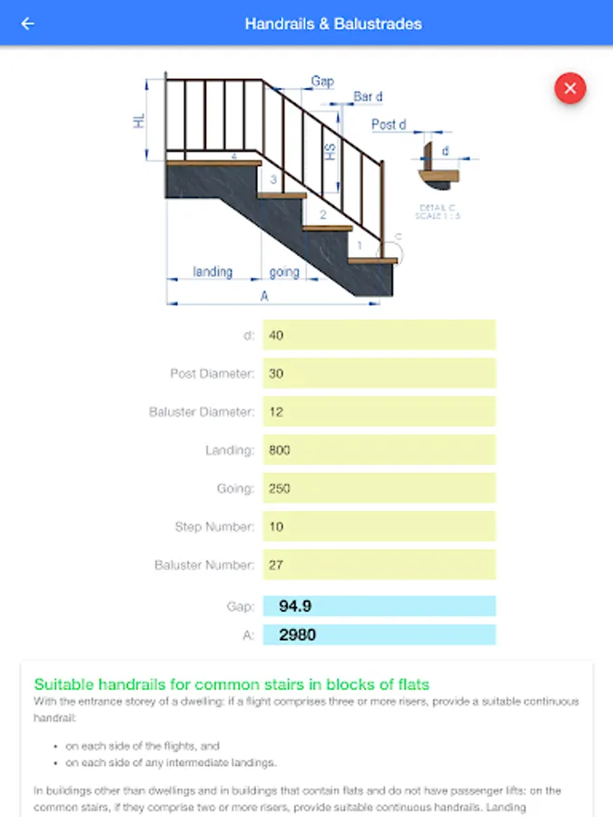 Handrails & Balustrade: calculate the gap between balusters and explain the British Building Regulations for stair balustrade.