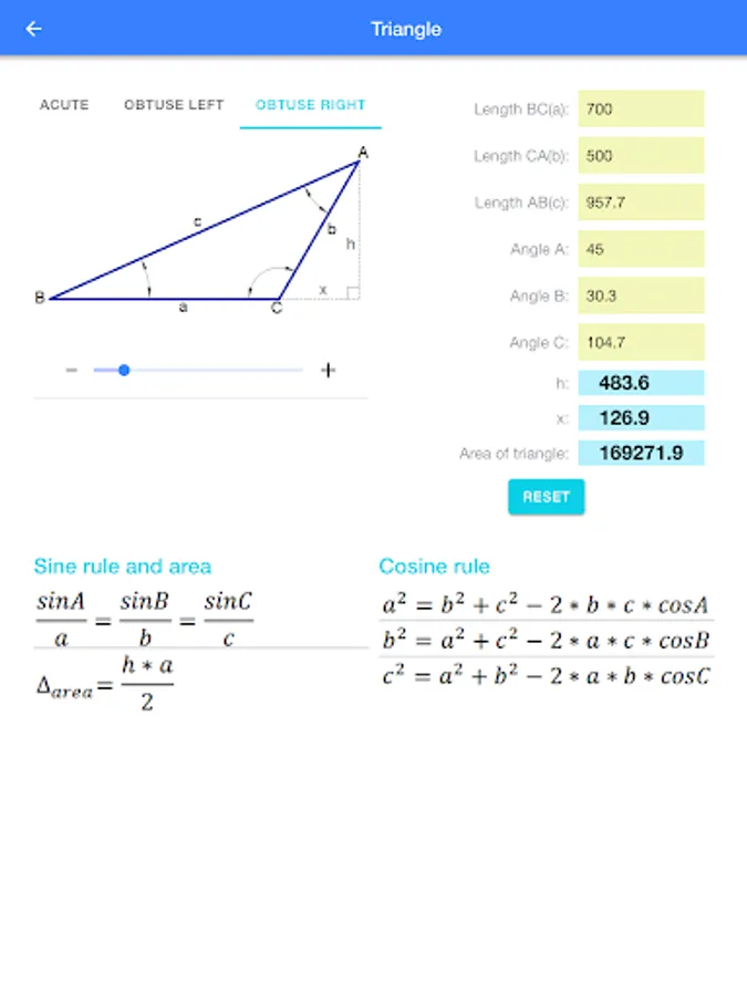 Triangle: calculate angles, length, and area.