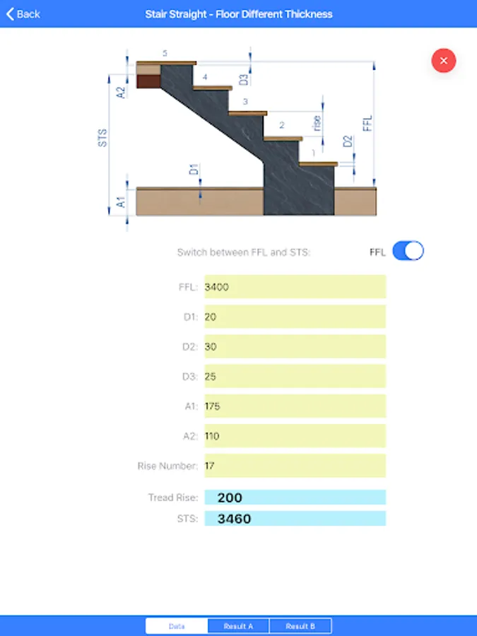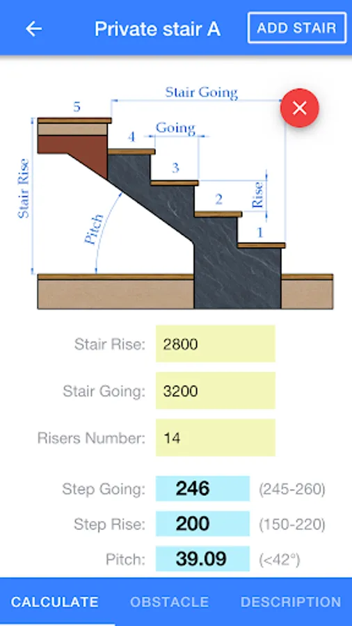 Straight Stairs: Calculate stair pitch angle, step going and rise. Is options Add Stair to compare results with building regulations. Is possible to calculate obstacle.