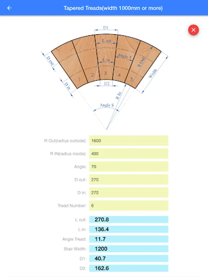 Tapered Treads width more and less than 1000mm: calculate stair inside, middle and outside going.